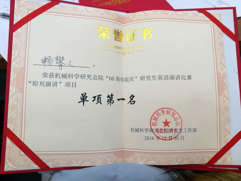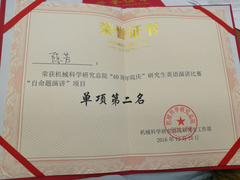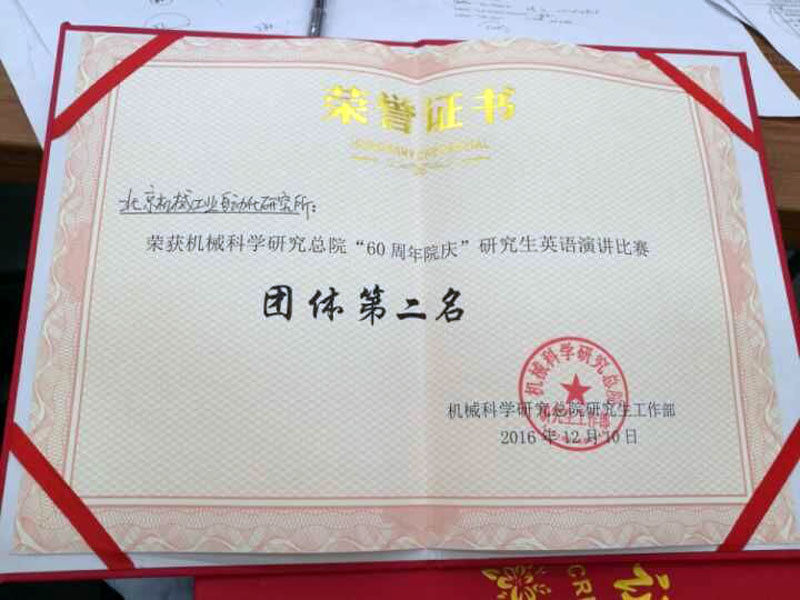 12月10日,北京機械工業自動化研究所(以下簡稱北自所)研究生代表隊參加了“迎院慶60周年”機械科學研究總院第二屆研究生英語演講比賽。此次比賽設“自命題演講”、“即興演講”和“創意表演”三項。      經過賽前的精心準備、刻苦訓練,在緊張又熱烈的比賽過程中,北自所參賽隊員陳芳、暢攀人、支嘉斌,張超在語言能力、演講技巧等綜合表現優秀,一舉奪得團體第二名,其中暢攀人獲“即興演講”單項第一名,陳芳獲“自命題演講”單項第二名。      通過本次比賽,極大的提升了北自所在讀研究生學習英語的熱情和語言表達能力,讓同學們從書面學習到敢于開口說英語、勇于展現自我。同時增強了科研、學習、工作的積極性,為以后走上科研崗位奠定了良好的基礎。