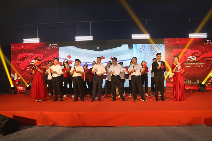 在演出的最后,北自所領導走上舞臺和現場人員合唱《我和我的祖國》將氣氛帶入高潮,200余名職工揮舞著國旗,一起歌唱祖國,共同慶祝盛世華誕,文藝匯演在裊裊歌聲和雷鳴般的掌聲中緩緩落幕。