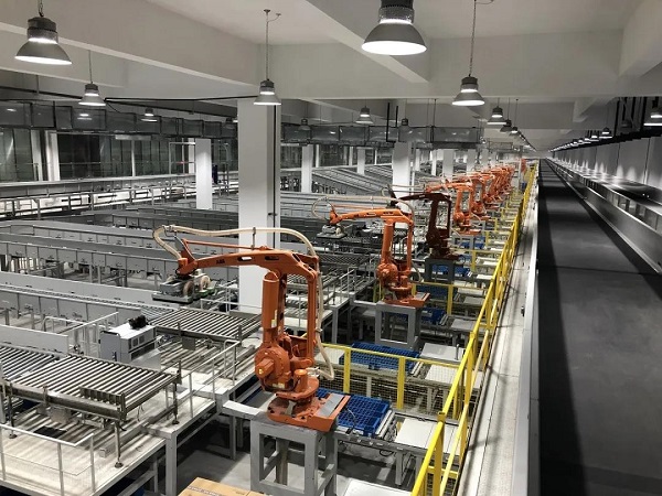該項目擁有箱式輸送線5000多米,貫穿南北廠區(qū)4個工廠、9座廠房、8條通廊、過街天橋及大型自動化立體倉庫,打造了一個全方位、智能化、立體化的物流中心。該系統(tǒng)服務(wù)于方太廚具供應(yīng)鏈,智能化物流中心存儲規(guī)模將達到25萬臺,發(fā)貨50000件/天,入庫35000件/天,充分滿足方太日益增長和不斷擴大的產(chǎn)能需求。交付完成的物流系統(tǒng)具備成品裝箱封箱后的件箱長距離輸送、機器人自動碼垛、托盤自動入庫、堆垛機自動入出庫、托盤自動出庫、機器人自動拆垛、件箱高速分揀等功能,實現(xiàn)了生產(chǎn)-碼垛-倉儲-拆垛-分揀-配送的全自動化流程,完全滿足各項技術(shù)指標(biāo)。
